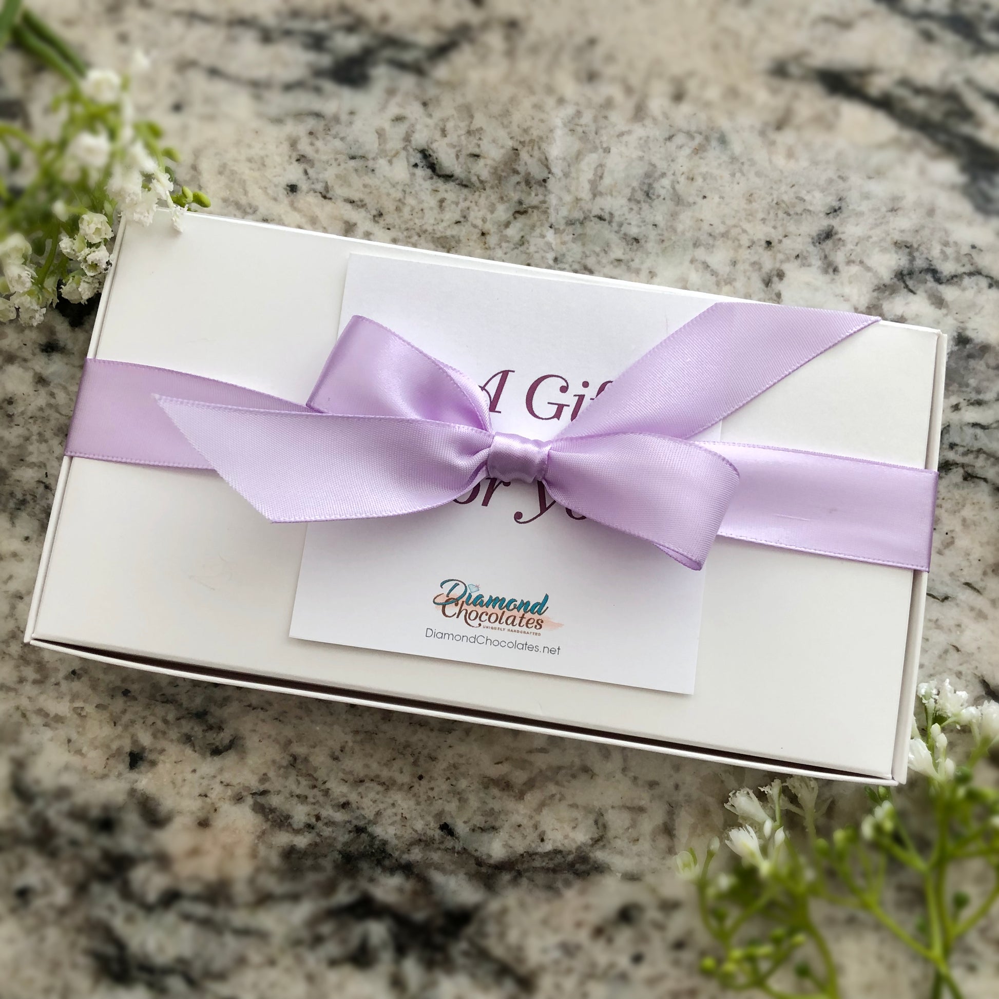 Includes 10 solid heart chocolates, and one solid 4.75" x 2.5" bar of chocolate. Available in a variety of flavor combinations. (Shown in photo: Mixed hearts, milk bar and lavender fondant).