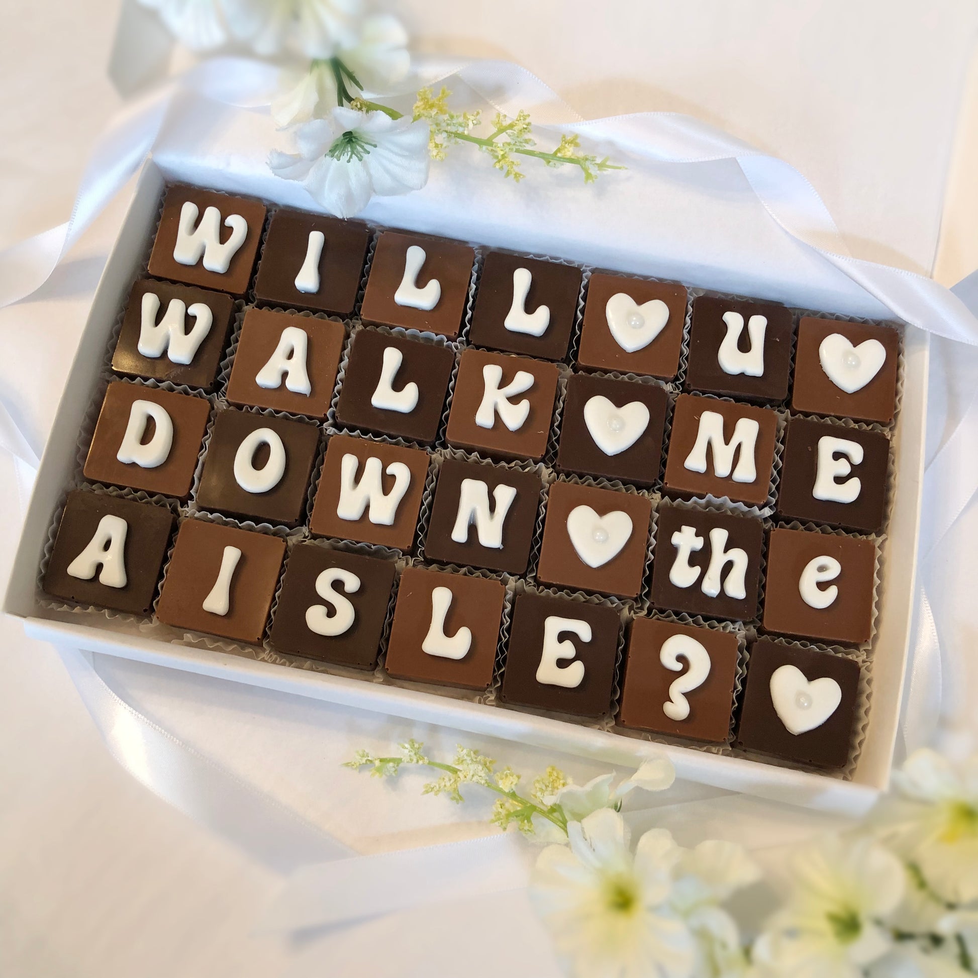 Give these chocolates as a unique way to ask that special and important person in your life, to walk you down the aisle. Will You Walk Me Down the Aisle chocolates are a perfect way to ask your Dad, Step Father, Mom, Brother, Grandpa or friend. 28 sweet and creamy solid chocolate squares spell out your question with fondant letters and pearl hearts. This unique gift of decadent chocolates, is presented in a white gift box and tied with a bow.